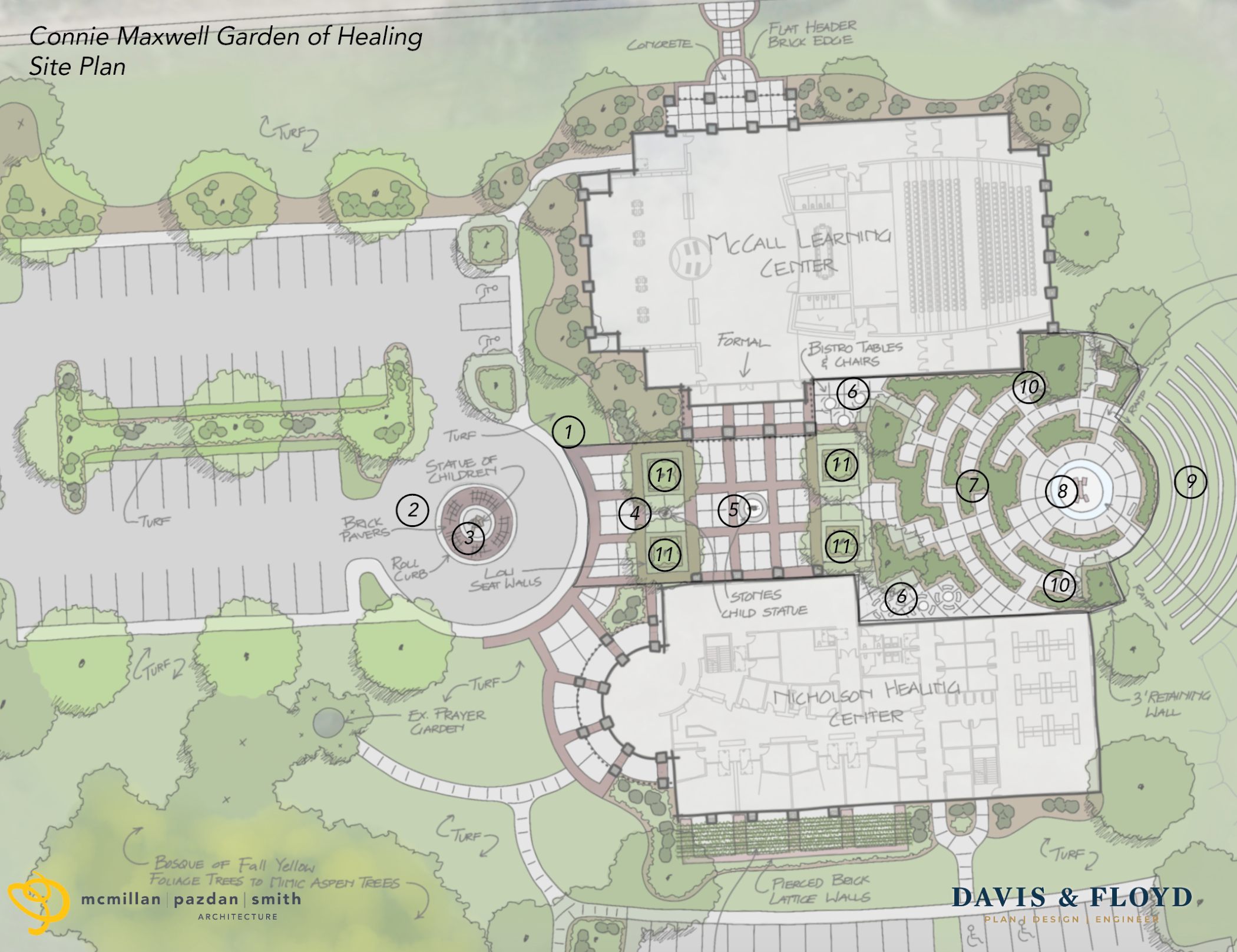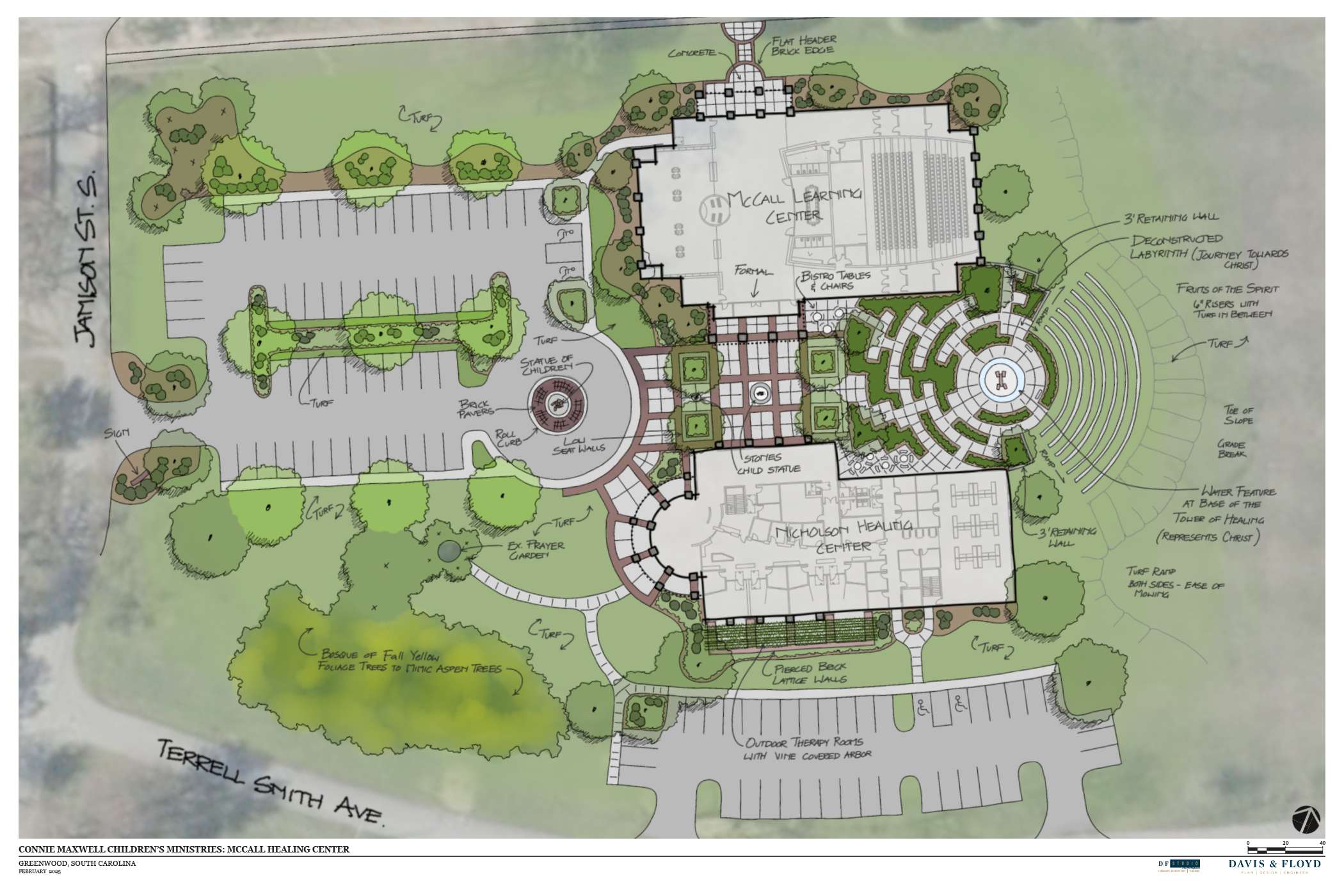 The plaza design tells two stories, the story of Connie Maxwell Children’s Ministries and the Gospel of Jesus Christ. To tell this story, the design journeys through several key experiences that include The Connie Maxwell Children Statues, Joshua Stones of Remembrance Monument, The Meditation Labyrinth, The Fountain of the Holy Spirit, The Tower of Faith and Healing, and The Fruits of the Spirit Terraces.