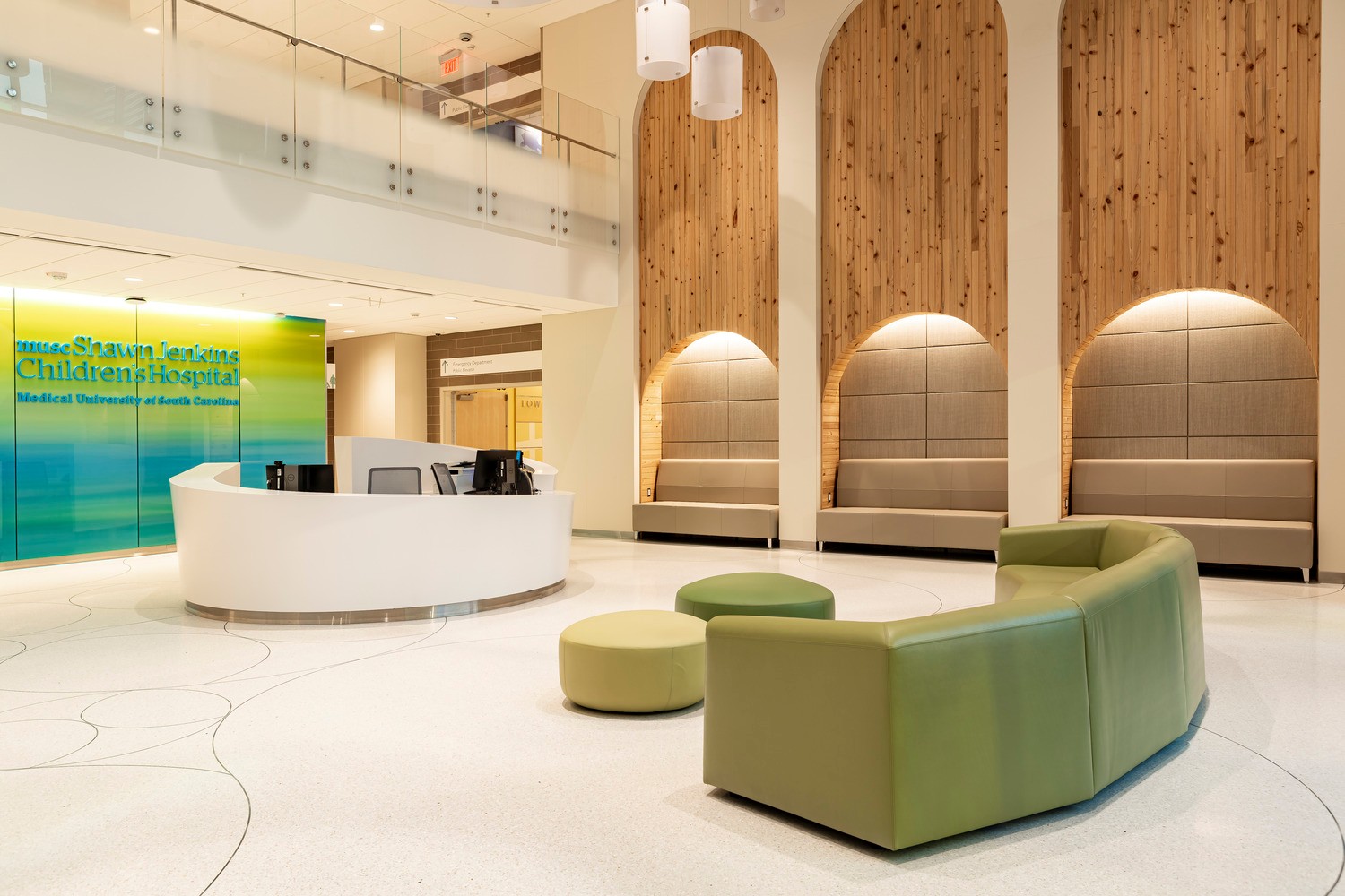 Alyssa is warmly welcomed at the Nicholson Center’s vibrant lobby, filled with playful elements like ladders, ships, and play walls. The Atrium sparks childlike wonder, designed to calm and engage every child. Incorporating nature, the center creates a soothing environment for all.